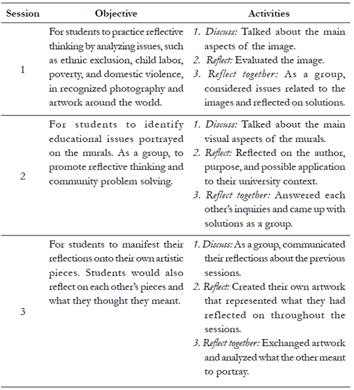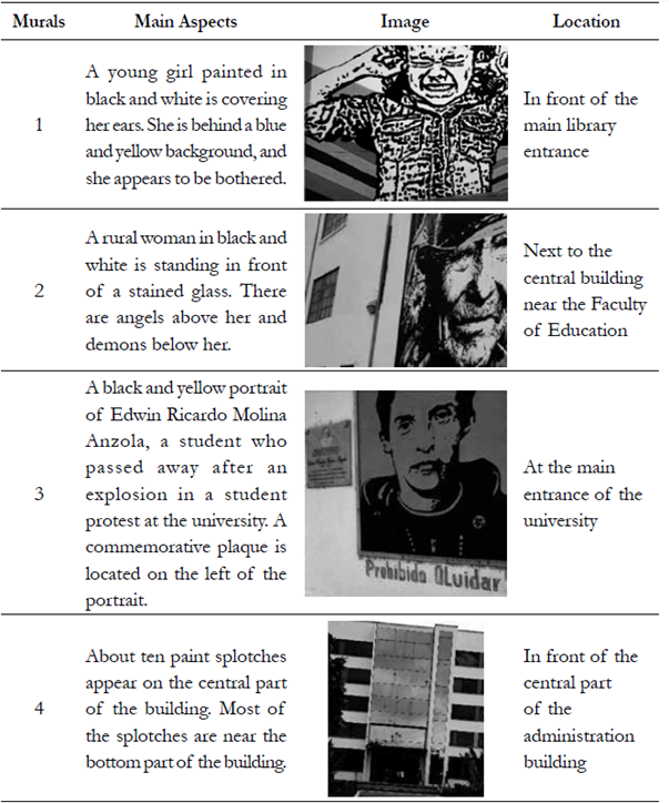 Objective of the pedagogical proposal. The main objective of this pedagogical proposal was for the participating students to discuss educational issues within their contexts. In particular, they would reflect on these issues through the artwork found on their university murals and their own creations. The teacher-researchers who directed this experience were the same authors of this paper. Both worked together in order to select and provide the material used in class, as well as guide the discussions regarding the university murals and the artwork created by the students.