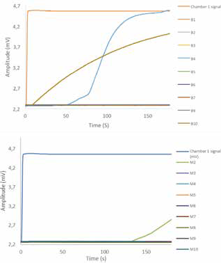Twenty-four experimental specimens were evaluated using the EMA gas permeability system. One specimen in each group was eliminated due to inconclusive measurements (sealing failure of epoxy resin detected). The positive control (empty canal) demonstrated synchronic sensitivity to pressure changes in both chambers. The negative controls (light cured composite-filled canals) tested negatively with no gas permeation between chambers. For the experimental groups, one MTA specimen and two Biodentine™ specimens recorded microleakage as shown in Figure 1. No statistical difference was observed between groups (p=0.527). Figure 2 shows the behavior of each sample per group during the analysis period.