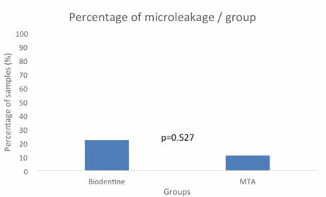 Previous investigations have evaluated the microleakage of apical barriers of MTA and Biodentine. Samuel et.al. compared the microleakage of MTA and Biodentine in primary molars by using SEM, showing similar results for both biomaterials. However, this last study must be interpreted cautiously, since the data evaluated was marginal adaptation and not the physical presence of microleakage (46). By using bacterial leakage through perforations in primary molars, Ramazani and Sadeghi (47) showed also a similar behavior for MTA and Biodentine. In accordance with these reports, our study showed similar results for both groups when evaluated with the gas permeability test (p=0.527). During the evaluation process, only 1 and 2 samples showed positive leakage for the MTA and Biodentine™ group respectively. It is important to highlight that gas leakage was not immediate, but a gradual response after several seconds of running the specimen through pressured nitrogen. However, as shown on figure 1, the MTA sample that failed, resisted longer before revealing nitrogen leakage. In the case of Biodentine, both failed samples showed gas leakage during the first minute of the experiment.