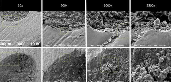 Representative SEM (30x, 200x, 1000x and 2500x) analysis are shown in figures 3 and 4 for MTA and Biodentine™ plugs respectively. All specimens showed acceptable and homogeneous marginal adaptation between the materials and the dental structure.
