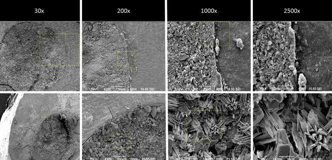 Regarding SEM analysis, observations were done at 4 different magnifications. All samples showed a good adaptation of the materials, and well define microstructures within both cores. MTA showed improved homogeneity, and less abrupt changes in the dentin-MTA interphase. Biodentine instead, showed in all samples an heterogenous surface full of crystalline structures.