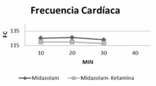 Al comparar la variable frecuencia cardiaca, se obtuvieron diferencias estadísticamente significativas entre ambos regímenes sedativos, al minuto 10 (p=0.017), al minuto 20 (p=0.008) y al minuto 30 (p=0.006) (Figura 1).