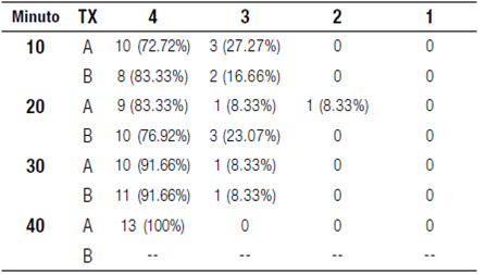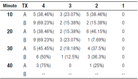 Al comparar el movimiento corporal, hubo diferencia significativa solamente en el minuto 20 (p=0.039); para los otros tiempos no hubo una diferencia: minuto 10 (p= 0.073) y minuto 30 (p= 0.48). El porcentaje de pacientes sin movimiento siempre fue mayor en el tratamiento B, excepto en el minuto 20, en el que el movimiento fue mayor bajo el tratamiento A; estos movimientos no afectaron substancialmente la realización de los procedimientos dentales programados (Figura 3).