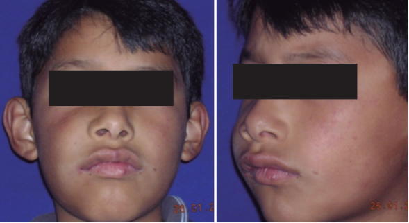Paciente masculino de 8 años de edad, natural de Cusco, acude al servicio de Diagnóstico por Imágenes de la Universidad de San Antonio Abad del Cusco, en enero del 2016, por presentar aumento de volumen y dolor intenso en región de heminara derecha, con un año de evolución aproximadamente. Paciente refiere que comenzó con una lesión pequeña localizada en mucosa vestibular que fue aumentando progresivamente, no refiere antecedentes de trauma alguno.