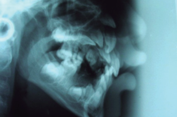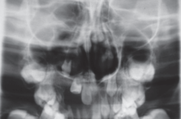 En la radiografía panorámica (Fig. 3) se observa amplia lesión con imagen pobremente radiolúcida unilocular con pequeñas radiopacidades en su interior proyectada en regiones que abarcan maxilar y cavidad orbitaria derecha aproximadamente 10 x 4 cm, con cortical parcialmente delimitada y bien definida, abarca en sentido transversal desde segmento radicular de pieza 21 hasta ápice de pieza 16, incluyendo ápices de piezas 51, 52, 53; y en sentido longitudinal desde cavidad orbitaria hasta 3mm superior al reborde alveolar. Se observa también dentro de la lesión imágenes radiopacas compatibles con piezas dentarias incluídas, correspondientes a piezas 13, 12, 11, las mismas que muestran desplazamientos en dirección cefálica. En la escanografía maxilar (Fig. 4) se puede observar la extensión y compromiso de la lesión con estructuras adyacentes comparadas con el lado izquierdo. La teleradiografía fue obtenida para observar la disposición y localización de las estructuras dentarias en relación a la lesión, mostrando más una vez desplazamiento de piezas dentarias comprometidas, pieza 13 con mínima cercanía a pared anterior de seno maxilar derecho (Fig. 5). En la radiografía oclusal se puede observar piezas 11 y 12 incluídas dentro de la lesión, flotando, condicionando desplazamiento de pieza 13 en dirección cefálica sin compromiso con seno maxilar derecho (Fig. 6).