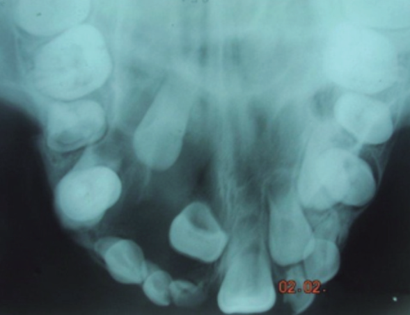 La segunda teoría es el inflamatorio, que aduce que el QD se forma en los dientes inmaduros como resultado de la inflamación de un diente deciduo no vital. Bloch (26) refiere que el origen del QD se produce por un deciduo necrótico superpuesto. La inflamación periapical resultante se diseminará para involucrar al folículo del sucesor permanente no erupcionado, produciendo exudado inflamatorio y consiguiente formación de lesión. Estos quiste se diagnostican en la primera y temprana parte de la segunda década de vida, sea por examen radiográfico de rutina o cuando el paciente se queja de hinchazón o dolor (27). Creemos que nuestro caso podría clasificarse como el segundo tipo de QD por las definiciones reportadas y por presencia de deciduos 51 y 52 en mal estado de conservación.
