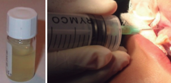 Previamente a la realización de la biopsia excisional, se planificó la aspiración de la lesión, obteniéndose líquido transparente por lo que se procedió con la enucleación total de ésta. La muestra obtenida fue colocada en formol al 10% para ser enviada a estudio histopatológico.