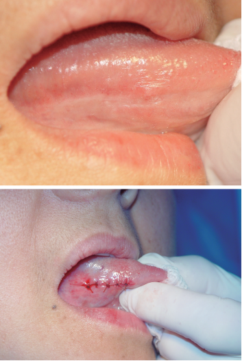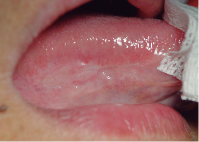Al realizar el examen clínico se observó cicatriz lineal en borde lateral derecho de lengua (paciente refiere que hace un año le biopsiaron leucoplasia con displasia leve, márgenes libres); en el extremo más anterior de la cicatriz presentaba lesión tipo placa eritematosa de 5 mm, superficie lisa y aterciopelada, la paciente refería “ardor” como si tuviera una herida abierta en la zona, sin embargo, ni los signos ni los síntomas se asociaban a trauma ni otro factor causal (Figura 1a). No se palparon adenopatías, ni se observaron alteraciones de contorno facial ni en piel.