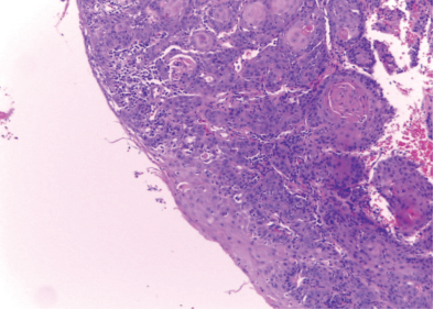 El análisis histopatológico reveló COCE invasor muy bien diferenciado, tumor de 2 mm de diámetro mayor, sin permeación de vasos linfáticos ni venosos, márgenes de resección libres de lesión (Figura 2).
