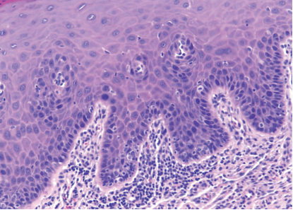 El análisis histopatológico reveló hiperqueratosis con displasia epitelial leve, márgenes de resección libres de lesión (Figura 4).