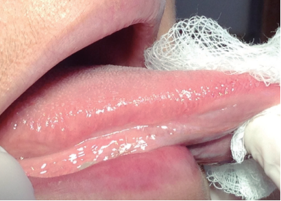 Al control de los tres meses paciente refiere sensación áspera y quemante en borde lateral derecho de lengua, clínicamente se observó sobre la cicatriz de la primera biopsia lesión tipo placa levemente más pálida que los tejidos circundantes, de 2 cm x 0.5 cm, límites definidos, superficie áspera con líneas que daban la impresión de una "hoja de árbol", no se removía con gaza (Figura 3).