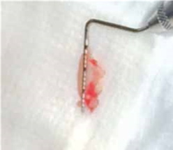 Se realizó la técnica anestésica infiltrativa con lidocaína al 2% en la zona palatina de donde se obtuvo el injerto de tejido conectivo y la técnica de bloqueo mandibular y lingual con refuerzo infiltrativo en la zona con el defecto gingival y receptora del tejido conectivo. Luego del alisado radicular suave en la zona del defecto con la cureta Gracey 7/8, se procedió a confeccionar el lecho para el tejido conectivo. Se realiza la técnica de bolsillo con una incisión intrasulcular a lo largo del defecto gingival a espesor parcial con micro hoja #64 la cual abarca zona interproximal sin poner en peligro la inserción del tejido del diente adyacente. Con esta incisión se logra que el tejido apical tenga una buena movilidad y desplazamiento coronal. Una vez preparado el nicho receptor se realiza la obtención del tejido conectivo del paladar. Con una sonda periodontal (PCPUNC156) se mide la longitud de la incisión a realizar.