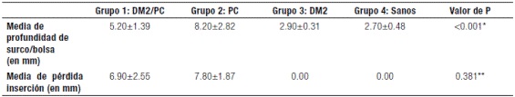 Se encontró diferencia significativa (p<0.001) al comparar la profundidad al sondeo periodontal del surco/bolsa entre los 4 grupos. Por otra lado, al comparar la pérdida de inserción presentada en los grupos periodontalmente comprometidos (1 y 2), esta no fue estadisticamente significativa (p=0.413).