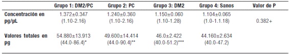 Adicionalmente, se realizó una correlación de Pearson entre los indicadores del estado glicémico utilizados y las cuantificaciones de CCL5, encontrándose que no existe correlación entre los valores de hemoglobina glucosilada y los niveles de RANTES, tanto de concentración (pg/µL) como en cantidad total (pg) en los 4 grupos de estudio: DM2/PC (r=0.019, p=0.937), PC (r=-0.124, p=0.602), DM2 (r=-0.068, p=0.775), sanos (r=0.001, p=0.995).