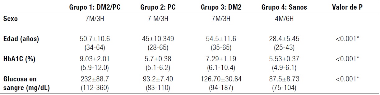 El 50% de los participantes fueron clasificados con DM2, 4 (20%) de los cuales presentaron buen control según los marcadores glicémicos, 7 (35%) un control medio y 9 (45%) fueron no controlados. 70 % (n=14) fueron mujeres y 30% (n=6) hombres, encontrándose en ellas un peor control glicémico según las cifras de HbA1C. Se observó diferencia significativa (p<0.001) entre los niveles glicémicos reportados entre los cuatro grupos (Tabla 2).