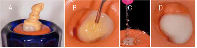 The internal aspect of the onlay was conditioned with 10% hydrofluoric acid for 1 minute. In order to avoid contamination of the ceramic surface, this procedure was performed including the ceramic restoration in a heavy silicone support (Figure 12).
