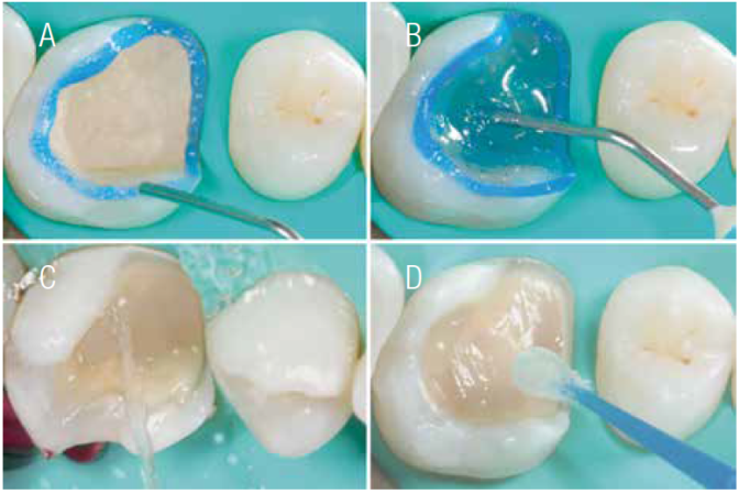 The tooth was prepared for bonding using a total-etch-technique 20)-(22 (Figure 13). The dental substrates were etched with 37% phosphoric acid for 30 seconds in enamel, and for 15 seconds on dentin. Then, the cavity preparation was rinse with an air-water spray and excess water was removed with a damp cotton pellet leaving the substrate slightly moist. Adper Scothbond MR Multi-Purpose Plus (3M ESPE, St Paul, MN, EUA) was applied on both substrates with a microbrush. First, the activator (n°1.5) was applied, followed by a slightly air spray for 5 seconds. Then, the primer (n°2) was used, followed by the catalyst (n°3.5). This adhesive system was selected, due to the used of a quimical initiator (benzoyl peroxide), which trigger the dual-polymerization reaction.