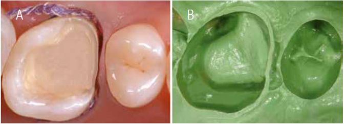 Once the rubber dam was removed, the cavity preparation was rinsed thoroughly. Then, two retractor wires (n°000, n°1) were inserted into the gingival sulcus (Ultrapack®, Ultradent, Utah, EUA) (Figure 7a). Impressions were made with silicone material (Express®, 3M ESPE, Califórnia, EUA) (Figura7b). An impression of the mandibular arch was obtained with irreversible hydrocolloid (Palgat Plus Quick, ESPE 3M, Alemanha). The patient’s register bite was achieved with a silicone material (Empress®, 3M ESPE, Califórnia, EUA), in order to registered major centric stops.