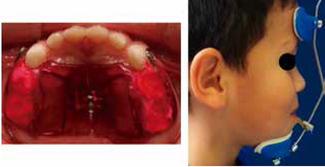 A Mexican 5.1 year old-boy came to the Pediatric Dentistry Postgraduate Program Clinic with the chief complaint of anterior crossbite and prominent lower teeth. Parents manifested that a child’s grandfather had a similar malocclusion. Medical history with no relevant information. On extraoral examination, the facial profile was convex, without facial asymmetry, anterior divergent face, competent lips, lower lip relatively protruded, and acute nasolabial angle (Figure 1). Intraoraly, the patient exhibited several enamel white spot lesions but not evident caries cavities; his primary dentition occlusion showed interdental spaces, a bilateral exaggerated mesial terminal plane and Class III canine relationship, anterior crossbite of the four primary incisors (overjet-5 mm and deep reverse overbite+3.5 mm); the upper arch exhibited a normal width. Functional examination no exhibited premature contact points, and oral hygiene and gingival conditions were considered as acceptable. His smile was unpleasent because the lack of display of upper incisors (Figure 2).