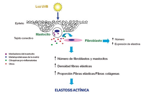 A pesar de que el fibroblasto tendría un rol preponderante en la formación de la elastosis actínica, diversos estudios sugieren que otros tipos celulares como el MC también contribuirían en forma significativa al daño actínico de la MEC 29-31.