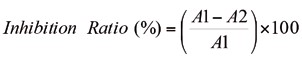 The antibacterial effectiveness of the homeopathic tinctures was expressed as the inhibition ratio according to the following equation: