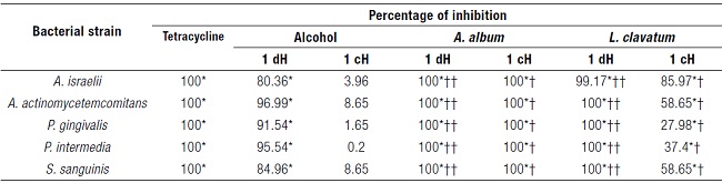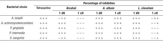 In the case of the Lycopodium clavatum tincture, the 1dH dilution showed strong activity (100% of inhibition) on the Gram-negative strains; A. actinomycetemcomitans serotype b, P. gingivalis, and P. intermedia. Additionally, an excellent inhibitory effect was observed against the Grampositive S. sanguinis and A. israelii (100 and 99.17 % of inhibition; Table 3).