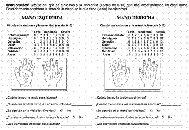 Se pidió a los participantes que calificaran la gravedad de los síntomas de la mano/muñeca, incluyendo entumecimiento, hormigueo, ardor o dolor en una escala de 0 a 10 (0=ninguno a 10=severo), y sombrear un diagrama de la mano en el lugar donde se encontraban sus síntomas. Se les preguntó también sobre la duración de los síntomas de la mano, los síntomas nocturnos, y las actividades que agravaban los síntomas. La gravedad de los síntomas de la mano y la muñeca se estratificó de la siguiente manera: Puntuación de ≤2 para los síntomas leves, la puntuación de ≥3 y ≤6 para los síntomas moderados, y puntuación de ≥7 para los síntomas severos 22. Las clasificaciones se llevaron a cabo por separado para la mano dominante y no dominante.