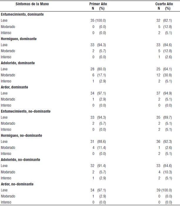 Para la mano no dominante, el 6% de los estudiantes de primero informaron entumecimiento moderado y ninguno informó entumecimiento grave en comparación con el 6% de los estudiantes de cuarto que reportaron 6% entumecimiento moderado y 6% que informó entumecimiento severo. Además, el 11% de los estudiantes de primero informaron hormigueo moderados y ninguno informó cosquilleo intenso, mientras que el 3% de los estudiantes de cuarto informó hormigueo moderado y 5% informó cosquilleo intenso. Por último, el 6% de los estudiantes de primero informaron dolor moderado y 3% reportó dolor severo en comparación con el 10 % de los estudiantes de cuarto que informaron dolor moderado y 5% dolor intenso.