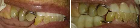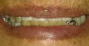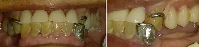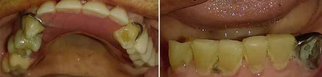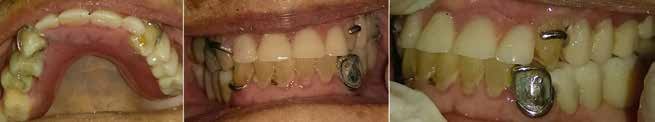 La evaluación clínica nos muestra restauraciones fracturadas, presencia de placa dentobacteriana y sarro dental, ausencias de órganos dentales anteriores superiores y posteriores inferiores, con prótesis removible parcial superior e inferior, y diversos desgastes dentales (Fig.1).