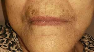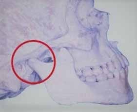 Después de la valoración correspondiente a su DV, tomando la distancia de la línea nasolabial y un punto marcado (Fig.3), se observa que en oclusión, la DVO es menor que la DVR, presentando un espacio libre mayor al rango normal aceptable, siendo de 7mm., lo que nos indica una posición condilar más posterior a la RC que ocasiona presión de la zona retrodiscal con inflamación de los tejidos que la rodean (Fig.4), lo que favorece a la presencia de zumbidos y vértigo en la paciente.