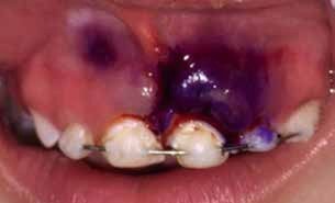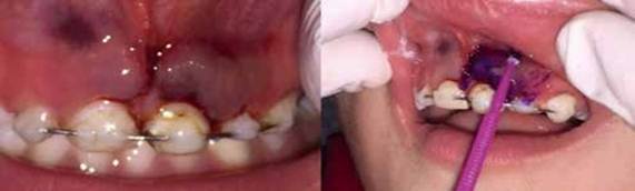 Se procedió a realizar ferulización de los dientes móviles con alambre de acero inoxidable 0.018 y resina fotopolimerizable, de canino a canino durante tres semanas. En la misma cita se aplicó irradiación láser de acuerdo a las especificaciones del sistema, además de violeta de genciana tópica. Se proporcionaron indicaciones de higiene oral cuidadosa (Figura 2). Después de una semana y se observa una disminución de la inflamación y del dolor (Figura 3).