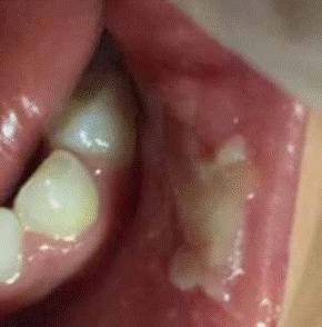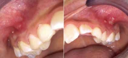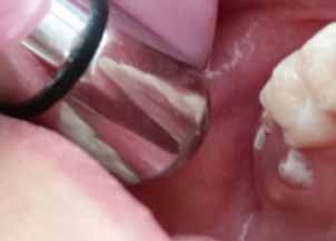 Paciente femenino de 8-4 años de edad, aparentemente sano, que se presentó a la clínica por dolor en la región retromolar superior del lado derecho. A la exploración clínica exhibió pericoronitis asociada a la erupción del primer molar permanente. Se aplicó irradiación láser terapéutico en la misma cita. Al terminar, el paciente manifestó una disminución significativa e inmediata del dolor (Figura 4).
