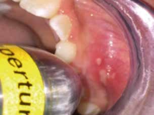 Paciente masculino 11-6 años, que presentaba dolor e irritación en las regiones posteriores vestibulares de la mucosa oral, en ambos lados de la cavidad oral. A la exploración clínica se detectaron úlceras aftosas en fondo de saco. Se aplicó terapia con láser en las zonas afectadas ese mismo día, y de dieron indicaciones de higiene y dieta libre de irritantes (Figura 5). Se citó al tercer día y se apreció mejoría en las lesiones y disminución considerable del dolor de acuerdo al paciente. Se realizó una segunda aplicación de láser terapéutico y a la semana siguiente el dolor desapareció por completo (Figura 6).