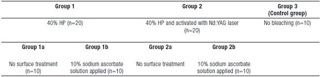 Fifty human first premolars freshly extracted for orthodontic purposes were selected. The inclusion criteria for tooth choice were as follows: unspoiled enamel, no previous treatment with acid or any peroxide solution, no restorations, no caries, and no cracks. First, they were disinfected by immersion in 0.5% chloramine-T solution (Merck, Germany) for a day. The crowns of the teeth were separated from their roots by being cut with a diamond disk 2 mm below the cementoenamel junction and embedded in autopolymerizing acrylic resin blocks (Panacryl; Arma Dental, Istanbul, Turkey) with their buccal surfaces exposed to ensure that the applied force during the shear test of the labial surfaces would be parallel. The specimen surfaces were then flattened by means of #600grit silicon carbide paper under water. Specimens were ultrasonically cleaned (Branson 8510; Branson Ultrasonics, Danbury, USA) for 10 min. The schematic representation of the experimental groups treated with different combinations of bleaching/ antioxidant procedures is presented in Table 1.