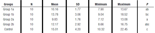 SBS data in MPa (mean and SD) for the groups are presented in Table 2. One-way ANOVA showed statistically significant differences in bond strength values among the groups (p<0.001).