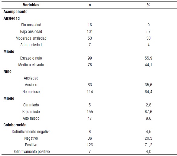La muestra final estuvo constituida por 177 niños (94 de sexo femenino, 53,1%) y sus padres (166 de sexo femenino, 93,8%). La edad media de los niños fue de 4,5+1,0 años y de los padres fue 32,9+6,3 años. Los tratamientos odontológicos realizados estuvieron distribuidos en un 87,6% como tratamientos invasivos y un 12,4%, en no invasivos. Con respecto a la ansiedad, los niños, en su mayoría, fueron no ansiosos (64,4%) y los padres presentaron baja ansiedad (57%). Con respecto al miedo, los padres presentaron escaso o nulo (55,9%) y los niños, bajo miedo (87,6%) en mayor proporción; el comportamiento de los niños fue positivo, observándose en 71,2% (Tabla 2). No se encontró relación entre la ansiedad del niño y de los padres (p=0,326) (Tabla 3). En la tabla 4, se evaluó la relación entre el miedo de los padres y sus hijos, dando como resultado una correlación directa, siendo estadísticamente significativo (p=0,009), observándose que en los padres que presentaban escaso o nulo miedo, sus hijos no presentaban miedo (80%). No se encontró relación entre la ansiedad y miedo de los padres y la colaboración de sus hijos (p=0,991 y p=0,1 respectivamente) (Tabla 5). En la tabla 6, se evaluó la relación de la ansiedad y miedo de los niños con la colaboración en el tratamiento odontológico, se encontró una correlación inversa, siendo estadísticamente significativa (p=0,010 y definitivamente positivo (85,7%) y que los niños p=0,001 respectivamente), observándose que los con bajo miedo presentaban un comportamiento niños no ansiosos presentaban un comportamiento positivo (92%).