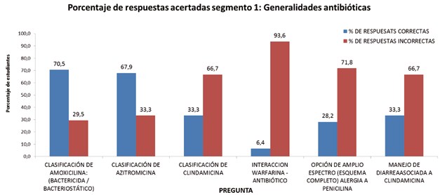 La figura 1 muestra los resultados para el primer segmento (generalidades de protocolos antibióticos). El 70,5% acertó en clasificar la amoxicilina como bactericida, y un 67,9% conoce que la azitromicina pertenece a la familia de los macrólidos. En la pregunta 3 donde se evalúo la clasificación de la clindamicina, solo el 33,3% acertó en clasificarlo como una lincosamida. Para la pregunta 4, un 6,4% de los encuestados reconoció una posible interacción farmacológica entre la azitromicina y el anticoagulante warfarina. Finalmente, la pregunta 5 donde se consultó sobre la primera opción antibiótica de amplio espectro para tratar pacientes alérgicos a los betalactámicos un 28,2% contestó correctamente y un 33,3% conoció el manejo correcto de la colitis pseudomembranosa y diarrea provocada por el uso de clindamicina.