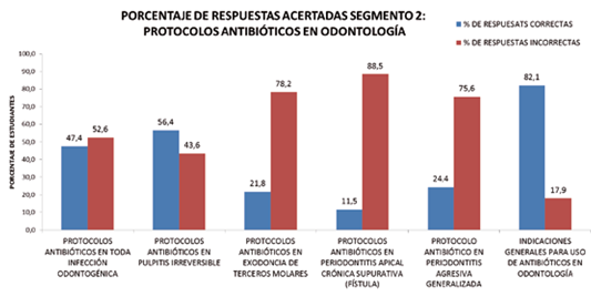 En el segundo segmento, la primera pregunta que evaluó la selección de protocolos antibióticos en cuadros de infecciones odontogénicas, fue acertada por el 47,4% de los participantes. Al evaluar el uso incorrecto de antibióticos tras seleccionarse para tratar cuadros de pulpitis irreversible (donde debe evitarse su uso) un 56,4% de encuestados evitó su uso. En relación al uso de protocolos antibióticos tras la exodoncia de terceros molares, un 21,8% respondió de forma correcta, mientras que en la pregunta 4 donde se evaluó si el diagnóstico de periodontitis apical crónica supurativa (presencia de fístulas) requería obligatoriamente el uso de antibioticoterapia, únicamente el 11,5% respondió de manera correcta. En cuanto al uso de antibióticos en presencia de periodontitis agresiva generalizada, un 24,4% conoce el protocolo correcto para su manejo. En la última pregunta de este segmento, se obtuvo un 82,1% de respuestas correctas, donde los estudiantes identificaron los signos y síntomas generales para prescribir la necesidad de tratamiento antibiótico en infecciones orofaciales (Figura 2).