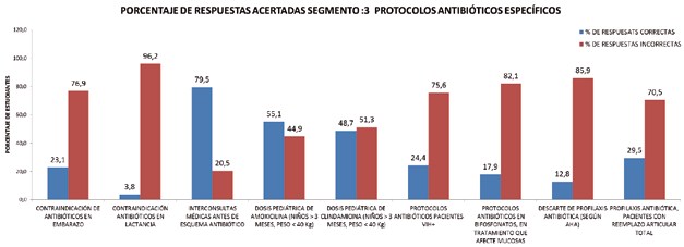En el tercer y último segmento donde se evalúa el nivel de conocimiento de los protocolos antibióticos específicos, se observó que en la primera y segunda preguntas, sólo un 23,1% y el 3.8 % de los participantes contestó correctamente las preguntas sobre esquemas antibióticos en mujeres embarazadas y en período de lactancia respectivamente, desconociendo información como que la doxiciclina debe evitarse en mujeres embarazadas ya que este medicamento tiene la capacidad de traspasar la placenta y afectar el desarrollo de huesos y piezas dentales del feto. Además, es importante mencionar que la mayoría de respuestas incorrectas indicaban que, en mujeres embarazadas, nunca bajo ninguna circunstancia deben recibir ningún tipo de antibiótico y pocos reconocieron que el uso de metronidazol no debe usarse durante la lactancia ya que produce un cambio de sabor en la leche materna que puede llevar al rechazo por parte del bebé 31) (34. En cuanto a la pregunta que evalúa las razones para llevar a cabo una interconsulta médica antes de iniciar un tratamiento antibiótico, la mayoría (79,5%) respondió correctamente. Esta situación se ejemplificó con un posible caso de un paciente con insuficiencia renal crónica. Tal como lo propone Fissell et al., este grupo de pacientes siempre deben contar con la autorización del médico tratante, ya que la excreción de los antibióticos por vía renal se verá afectada aumentando la toxicidad de los antibióticos (35. Para evaluar el conocimiento del uso de antibióticos en pacientes pediátricos, se diseñaron las preguntas 4 y 5. Mientras que solo un poco más de la mitad (55,1%) conoce la dosis de amoxicilina para niños mayores de 3 meses de edad y que pesen menos de 40 kg (20-40 mg/kg/ día, dividida en dosis iguales cada 8 horas 36), el 48,7% conoció que la opción para manejar infecciones odontogénicas agudas en pacientes alérgicos a penicilinas u otros beta-lactámicos era utilizar clindamicina en dosis de 8-20 mg/kg/día, dividido en 3 a 4 veces al día, de acuerdo a la Academia Americana de Odontopediatría (37. Los estudiantes tampoco contaron con el conocimiento suficiente para el empleo de protocolos antibióticos en pacientes VIH+, ya que más de tres cuartas partes (75,6%) obtuvo resouestas incorrectas. De ser necesario, es recomendable considerar utilizar tratamientos antibióticos de bajo espectro como el metronidazol por al menos 5 días, para disminuir la posibilidad de crecimiento de microorganismos oportunistas 38) (39. De manera similar fue el desconocimiento del manejo de pacientes que están bajo tratamiento con bifosfonatos, y que presentan una lesión en sus mucosas con afectación del hueso subyacente producto de un procedimiento dental. El 82,1% desconoce que el esquema recomendado, según Marx et al., es el uso de esquema completo de antibióticos de amplio espectro en combinación con el uso de clorexidina al 0.12%, debido principalmente a la posible presencia de actinomyces en el tejido óseo (40. Las últimas 2 preguntas se destinaron a evaluar el nivel de conocimiento sobre los esquemas de profilaxis antibiótica. Un 85,9% desconoce la actualización del año 2007 de la guía propuesta por la Asociación Americana del Corazón, la cual elimina entre las indicaciones de profilaxis antibiótica pacientes controlados, pero con historia de condiciones como prolapso de la válvula mitral, defectos congénitos o enfermedad de la válvula bicúspide 41) (42, reduciendo así el uso de antibióticos en casos que no es necesario. Por último se observó que un 29,5% realiza profilaxis antibiótica en pacientes que han sido sometidos a remplazos articulares de cadera, hombro o rodilla, ya que según la Academia Americana de Ortopedia siempre se debe realizar profilaxis antibiótica antes de recibir atención odontológica, ya que existe un posible riesgo de contaminación cruzada de la zona intervenida dando como resultado el rechazo de la prótesis, esto a diferencia de la presencia de material de osteosíntesis en otras partes del cuerpo que no tienen contacto con el líquido sinovial como las prótesis utilizadas para el remplazo articular 41) (43.