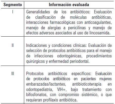 Se diseñó un instrumento tipo cuestionario construido con base en diferentes publicaciones disponibles que evaluaron los niveles de conocimiento en temas de antibioticoterapia en Odontología.