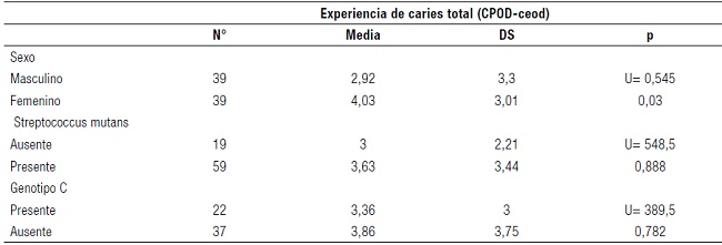 Los datos fueron procesados en el programa SPSS versión 25. Se utilizó la prueba U de Mann Whitney para comparar la experiencia de caries según sexo, presencia de Streptococcus mutans y presencia de genotipo C. El nivel de significancia considerado fue 5%.