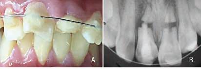 At the time of the clinical examination, the patient was observed with a splint on the four upper central incisors, the gum was red in color, smooth, bright, and with an increase in volume in the upper anterior, which presented a sounding depth of 5 mm (Figure 1a). The radiographic examination showed a radio-lucid line located in the middle third of dental organs 1.1 and 2.1 (Figure 1b).