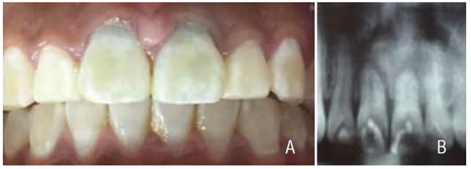 At the time of the clinical examination, the upper central incisors (1.1 and 2.1) are observed with a greenish hue, the gingiva is bright red in color, with a sounding depth of around 3 mm. On radiographic examination, it can be observed that the upper central incisors possess a reduced root size (Figure 3).