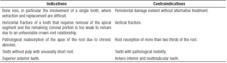 Compared with conventional implants, the objective is to preserve the natural teeth, since the implant is placed through the root canal, principally in organs with horizontal trauma and indication is dental extraction. With the latter, we ensure a natural epithelial union of the dental organ itself with periodontal structures, and that the pin has the function of prolonging the length of the root and decreasing the abnormal mobility of the tooth (1,9). The aim of this paper was to describe two case reports about of trans-endodontic implant technique.