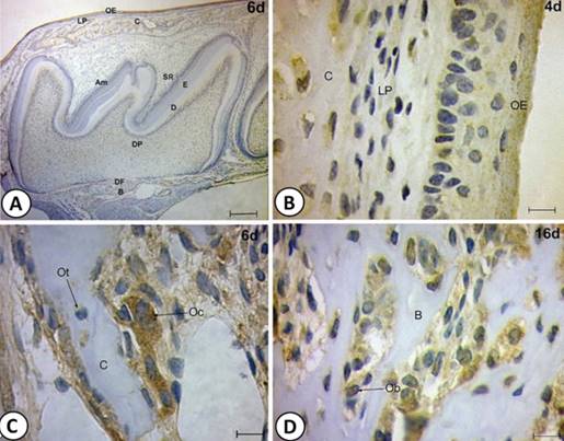 Four-day-old animals showed weak MMP2 expression in the osteocytes and osteoblasts observed at the base of the bony crypt. Moreover, the expression in the osteocytes was not homogeneous. There was a small amount of bone matrix and few osteocytes, characterizing the early formation of bone trabeculae. Six-day-old animals showed more developed bone trabeculae with an increased number of osteoblasts, which were expressing MMP-2. Nine-day-old animals had thicker bone trabeculae and an increased number of osteoblasts, which presented strong MMP-2 expression. Eleven- and 14-day-old animals presented similar expression pattern to those described above (nine days), but bone deposition was even more evident in the 14-day-old animals. In the 16-dayold animals, osteocytes and osteoblasts showed strong MMP-2 expression (Figure 1D), and the bone matrix was distinctly thicker.