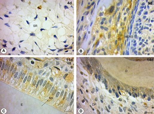 The animals were anesthetized by intraperitoneal injection with ketamine (30 mg/ kg) and xylazine (3 mg/kg), and euthanized by decapitation. The maxillae were removed, dissected and the fragments containing the first molars were fixed at room temperature for 48 hours in 4% formaldehyde solution buffered with 0.1 M sodium phosphate, pH 7.2. Next, the jaws were decalcified in 7% EDTA solution containing 0.5% formaldehyde buffered with 0.1 M sodium phosphate, pH 7.2, for 40 days, and after this period, the specimens were processed to be embedded in paraffin. The paraffin blocks were submitted to microtomy to obtain non-serial sections with 3 μm thickness for immunohistochemistry.