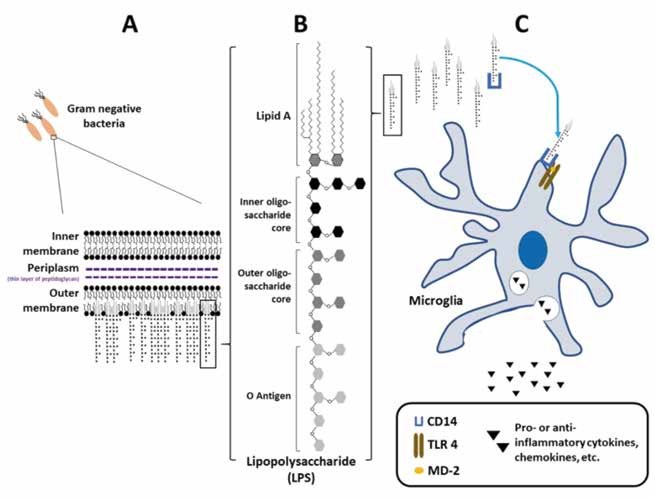 Lipopolysaccharide (LPS) is a component of the outer membrane of Gram-negative bacteria and its major virulence factor (Figure 1 A, B). It is a potent endotoxin that provides a persistent inflammatory stimulus (1). Systemic administration of LPS, even at low doses, induces the production of pro-inflammatory cytokines that activate the neuroimmune and neuroendocrine systems, resulting in sickness behavior (2). Specifically in rats, the acute administration of LPS induces symptoms of depression such as anhedonia, diminished cognitive function, retarded motor activity, reduction in exploration, decreased social interaction, fever, hypersomnia, activation of the hypothalamicpituitary-adrenal axis, and increased sympathetic activation (3-6).