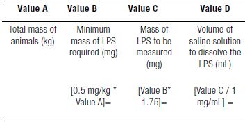 To the mass of reagent measured in the vial, add the volume of corresponding saline solution to reach a solution of concentration 1 mg LPS / mL (Value D, Table 2). This is to inject 0.5 mL per kg of the weight of the rat with this dose (0.5 mg LPS / kg). For example, if you calculate that the total weight of the rats to be injected is 2545 grams (g), dilute 2545 mg of LPS in 2545 mL of saline.