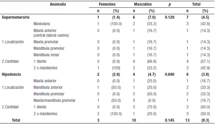En total se encontraron 13 (8.3 %) anomalías de número, de las cuales 6 de ella se localizaron en la maxila, 5 en mandíbula y 2 en ambas. No se encontró diferencia estadísticamente significativa (p=0.145) en la frecuencia según el género. Los dientes supernumerarios fueron más frecuentes en maxila y las ausencias en mandíbula. Ambas anomalías ooooode número se presentaron tanto de forma única como doble o múltiple (Cuadro 1).