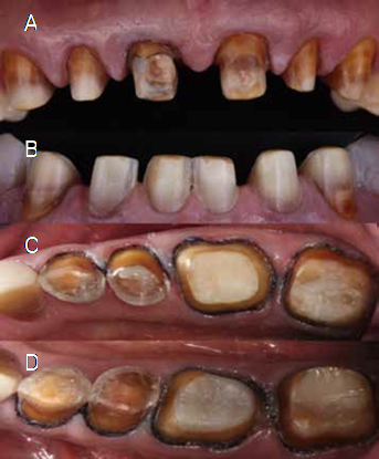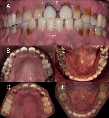 Male patient, 54 years of age, who is referred to the Specialty in Aesthetic Dentistry, Cosmetic, Restorative, and Implantology of the Faculty of Stomatology, Autonomous University of San Luis Potosí, Mexico, with spontaneous pain in the upper teeth along with NCCL in the upper and lower teeth, compromising the aesthetics and functions of the dentition. His clinical history reports the high and continuous intake of carbonated and acidic beverages, as well as the prolonged consumption of medications during 15 years due to a vehicular accident. Signed informed consent was obtained from the patient to publish his case.